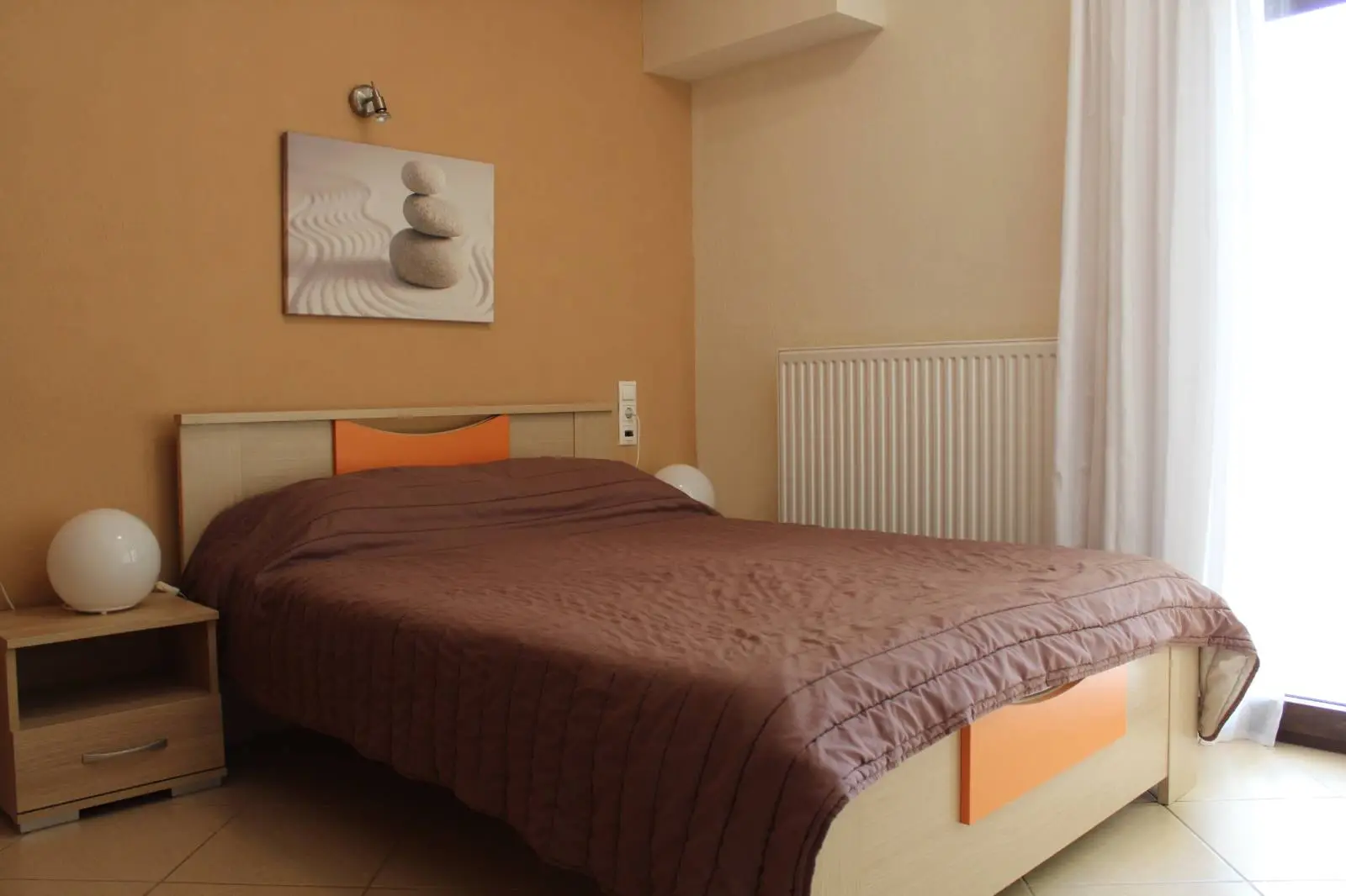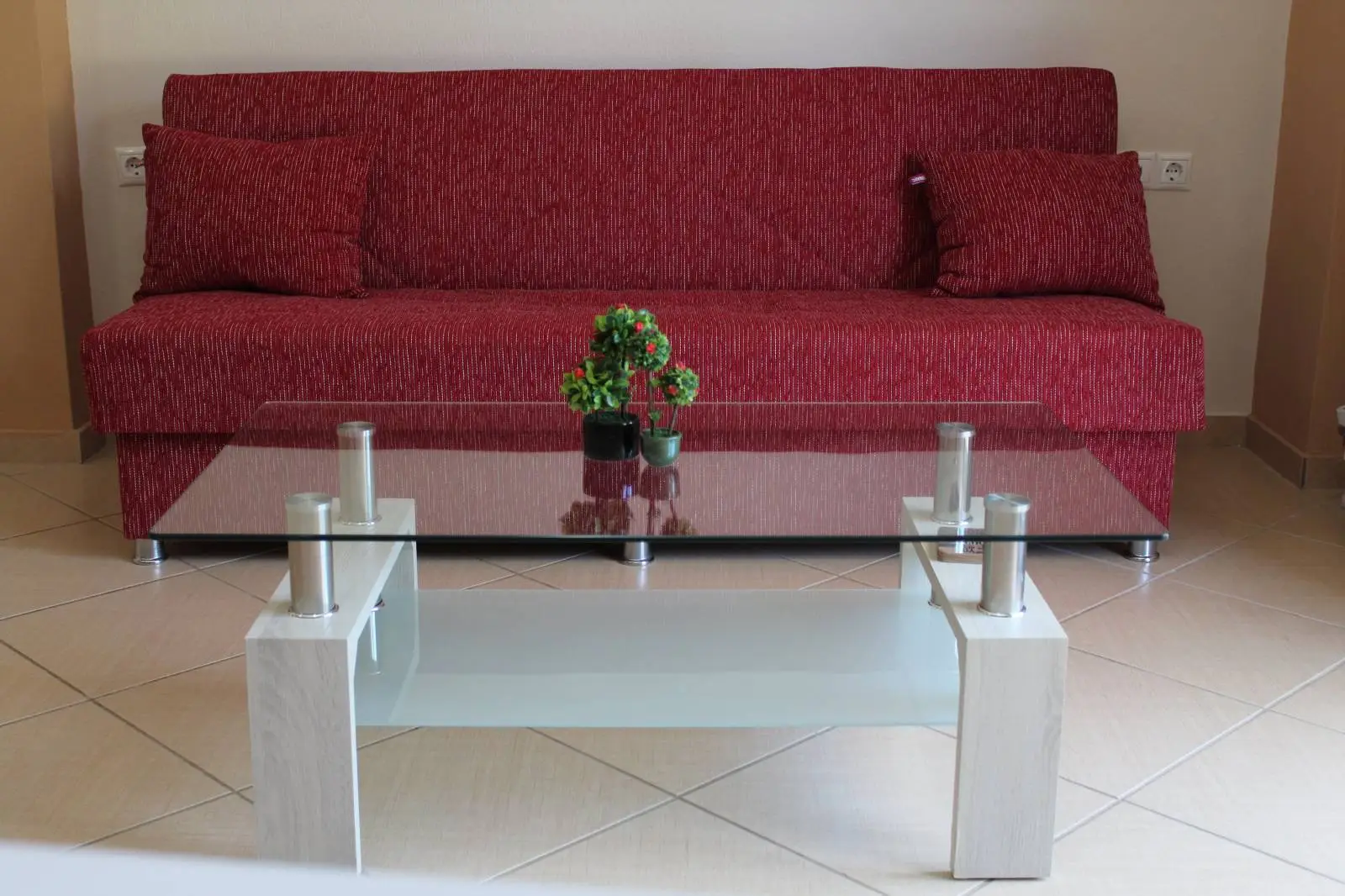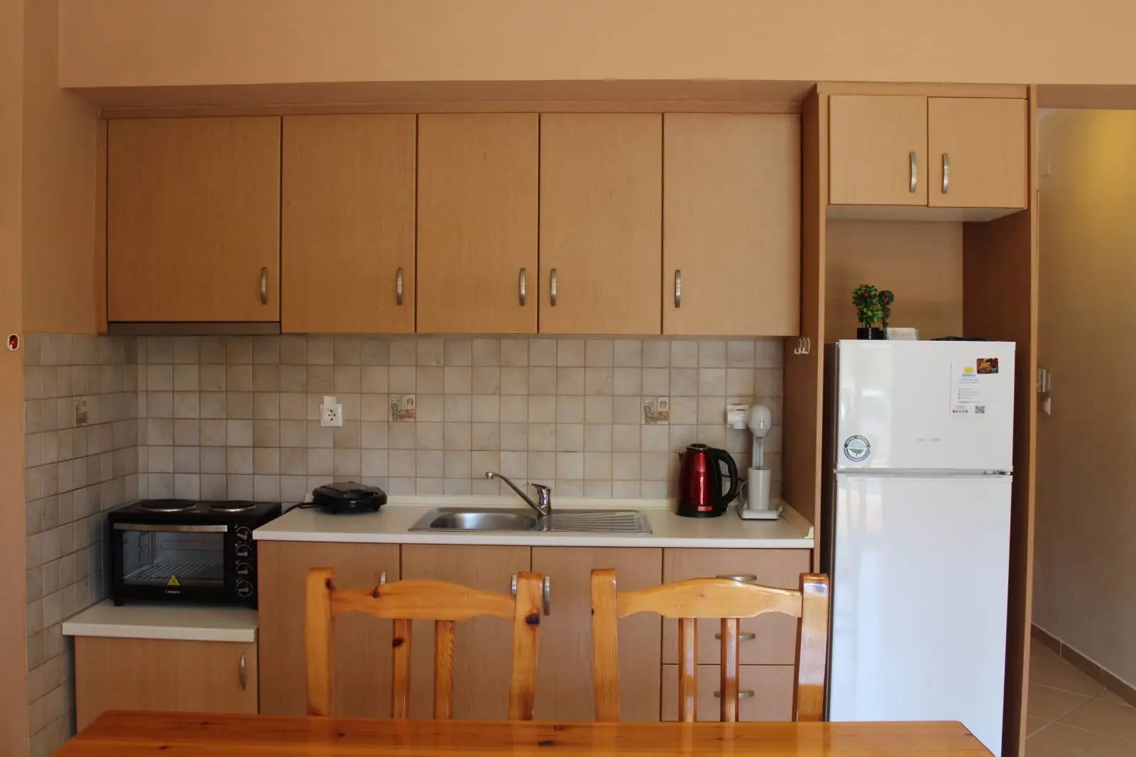 This 55 sq.m. apartment, located on the ground floor, can accommodate up to 3 guests. It features a spacious open-plan living,  a 43″ LED TV, kitchen area with a sofa bed, a dining table, and a fully equipped kitchen with a small oven, cooking hobs, and a fridge-freezer.