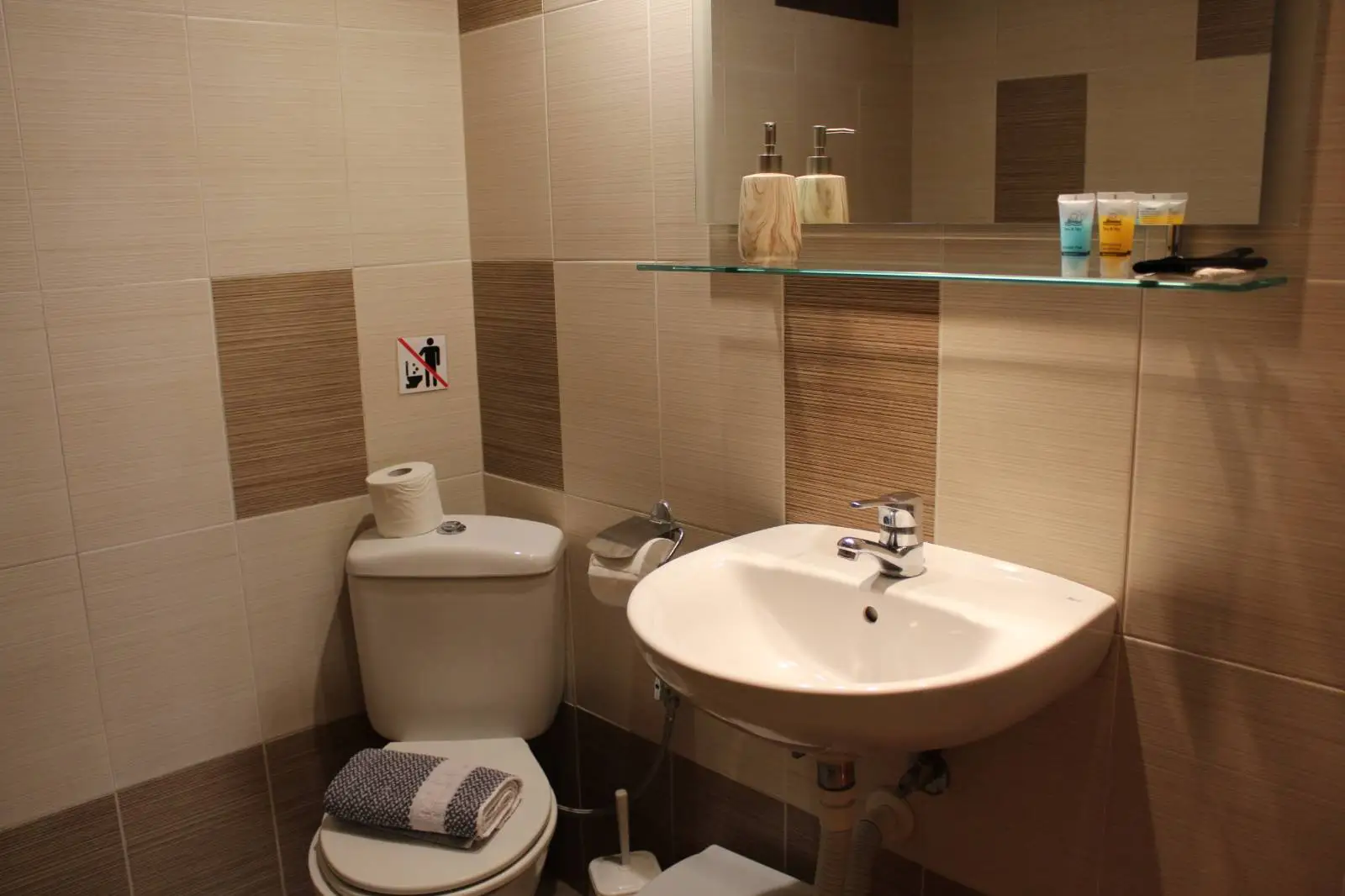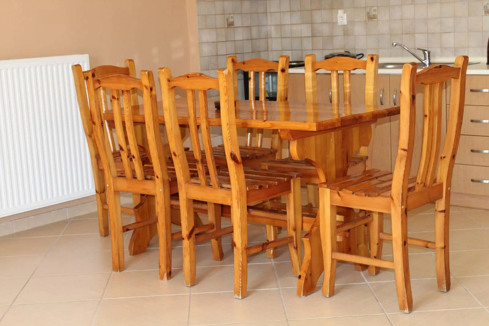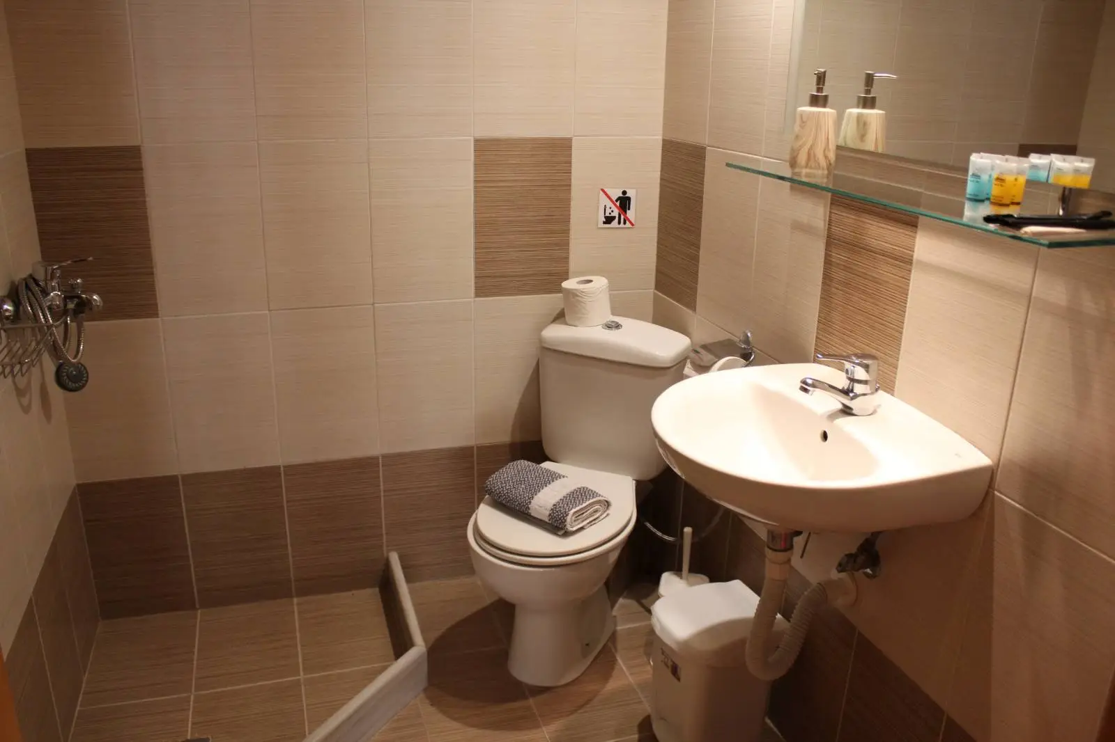 This 55 sq.m. apartment, located on the ground floor, can accommodate up to 3 guests. It features a spacious open-plan living,  a 43″ LED TV, kitchen area with a sofa bed, a dining table, and a fully equipped kitchen with a small oven, cooking hobs, and a fridge-freezer.